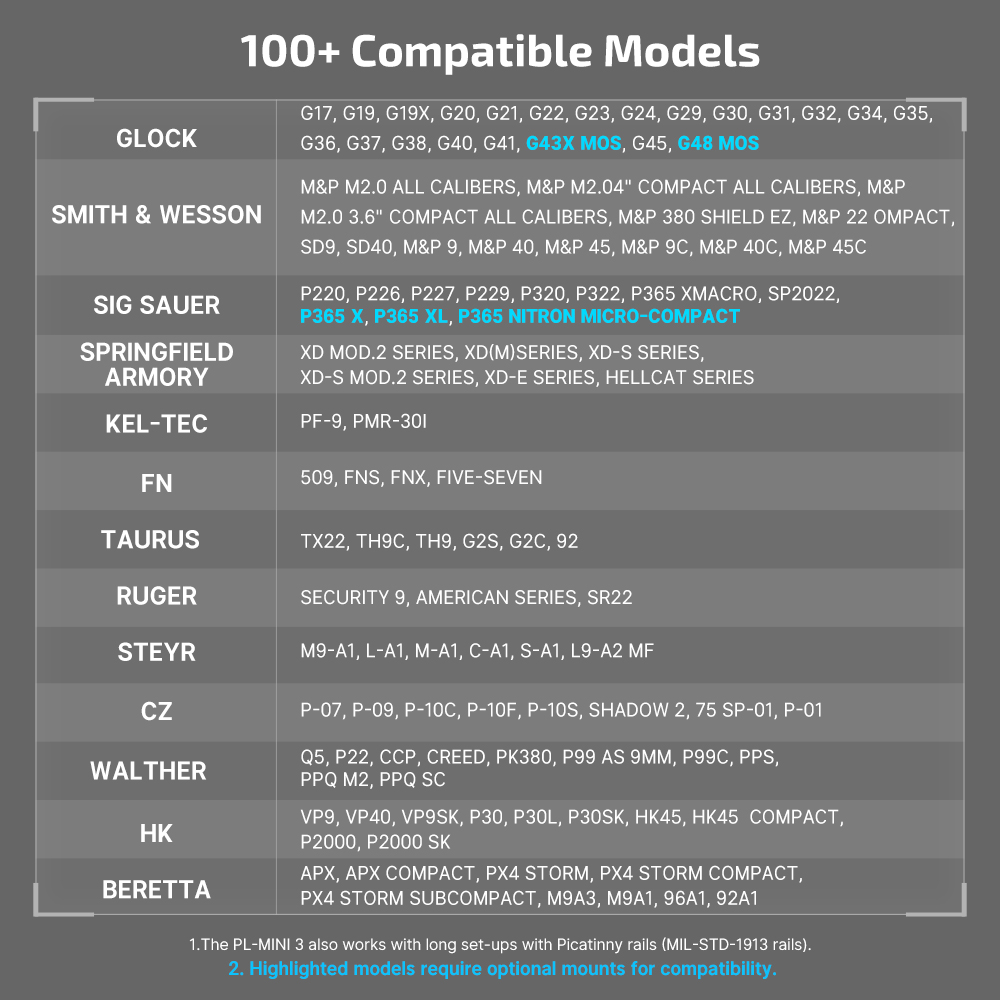 Superior Versatility: Equipped with a preinstalled Picatinny rail mount (Hellcat, GL, and 1913 rail adapters included), plus optional G43X MOS rail, P365 rail, and quick-release rail, this light reaches new heights of adaptability.
