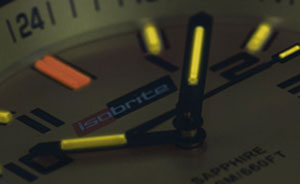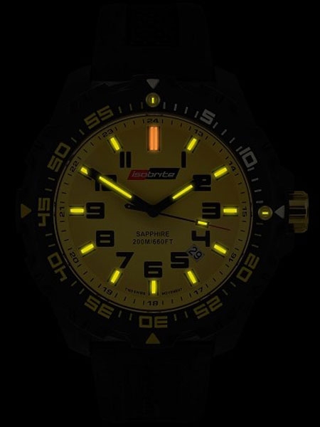 Bezel: Unidirectional ratcheting diver bezel with two tritium elapsed minute markers
