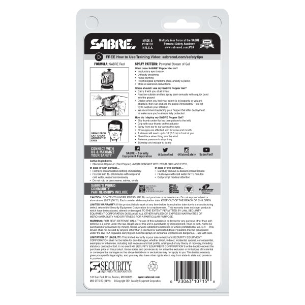დარჩით უსაფრთხოდ SABRE-სთან ერთად. SABRE ეს მოდელი არის ყველაზე პოპულარული, შეიცავს UV მარკირების საღებავს, რომელიც ეხმარება პოლიციას ეჭვმიტანილის იდენტიფიკაციაში. SABRE Crossfire Pepper Gel ქამრის სამაგრით გთავაზობთ დაცვას შთამბეჭდავი მანძილიდან 18 ფუტის (5,5 მეტრის) დიაპაზონიდან და უზრუნველყოფს დაცვას მრავალი საფრთხისგან 18 გამოფრქვევით. SABRE Crossfire-ის ტექნოლოგია საშუალებას აძლევს წიწაკის გელის შესხურებას ნებისმიერი კუთხით, თუნდაც თავდაყირა, რაც მაქსიმალურად აძლიერებს სამიზნეებს და ხდის მას უფრო საიმედოდ მოძრავი საფრთხეების წინააღმდეგ. გადახურვის უსაფრთხოების მექანიზმი ხელს უშლის შემთხვევით გამონადენს, ხოლო დამაგრებული ქამრის სამაგრი გაძლევთ საშუალებას ატაროთ თქვენი წიწაკის გელი სამსახურში, სახლში, ან მოგზაურობისას. წიწაკის გელის გამოყენება ქარიან ამინდშიცაა შესაძლებელი რადგან გელი ეწინააღმდეგება ქარს, ასევე შეგიძლიათ უსაფრთხოდ გამოიყენოთ შენობაშიც. SABRE Pepper Gel დამზადებულია აშშ-შიოჯახური საკუთრება და 45 წელზე მეტი ხნის განმავლობაში მოქმედი SABRE არის #1 ბრენდი, რომელსაც ენდობიან მომხმარებლები მთელს მსოფლიოში წიწაკის სპრეებისთვის და არის ლიდერი უსაფრთხოების პროგრამებისა და უსაფრთხოების ვიდეოების შემუშავებაში, რომ გაზარდოს საბოლოოდ მომხმარებლის უსაფრთხოება მაქსიმალურად.